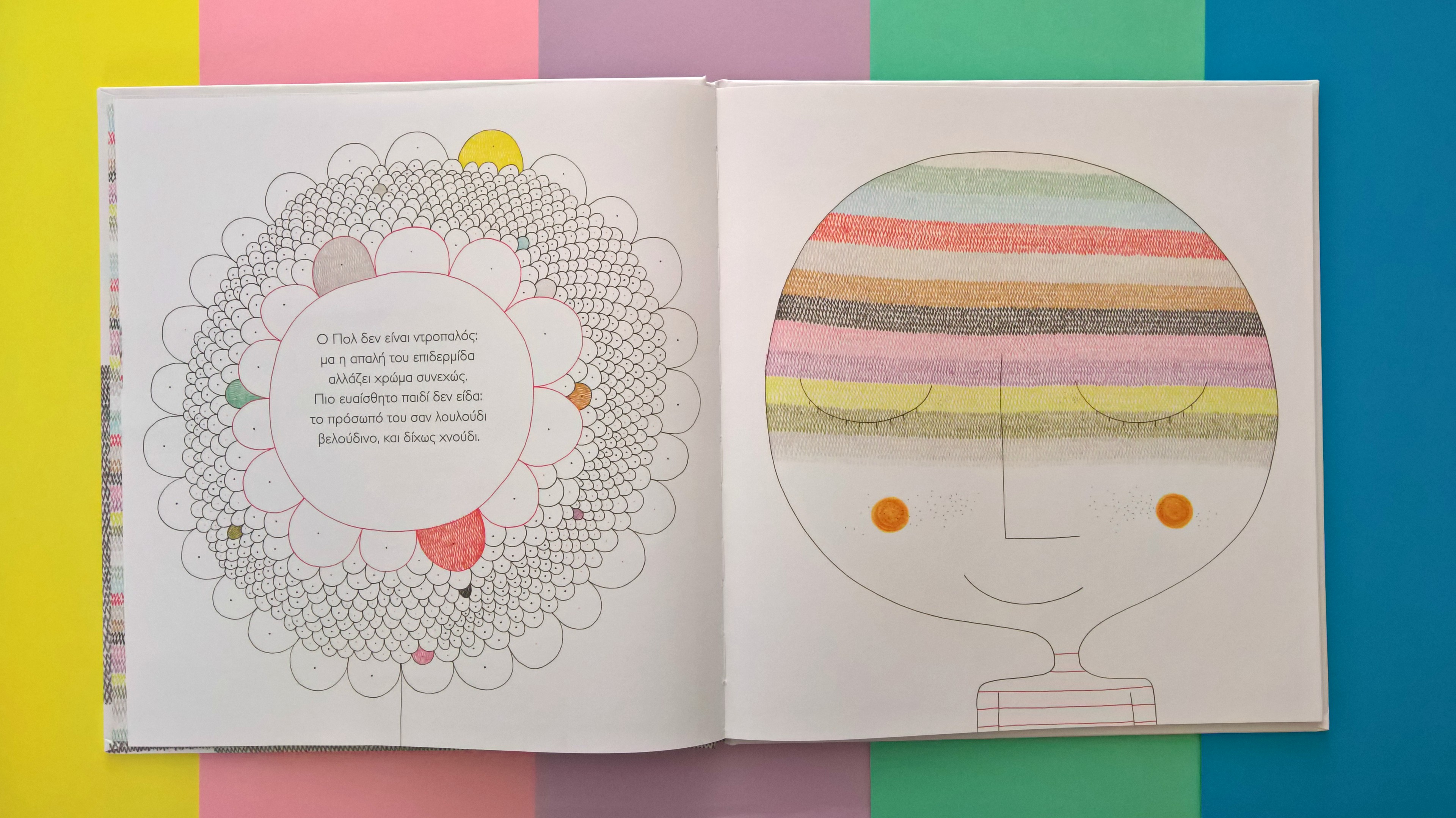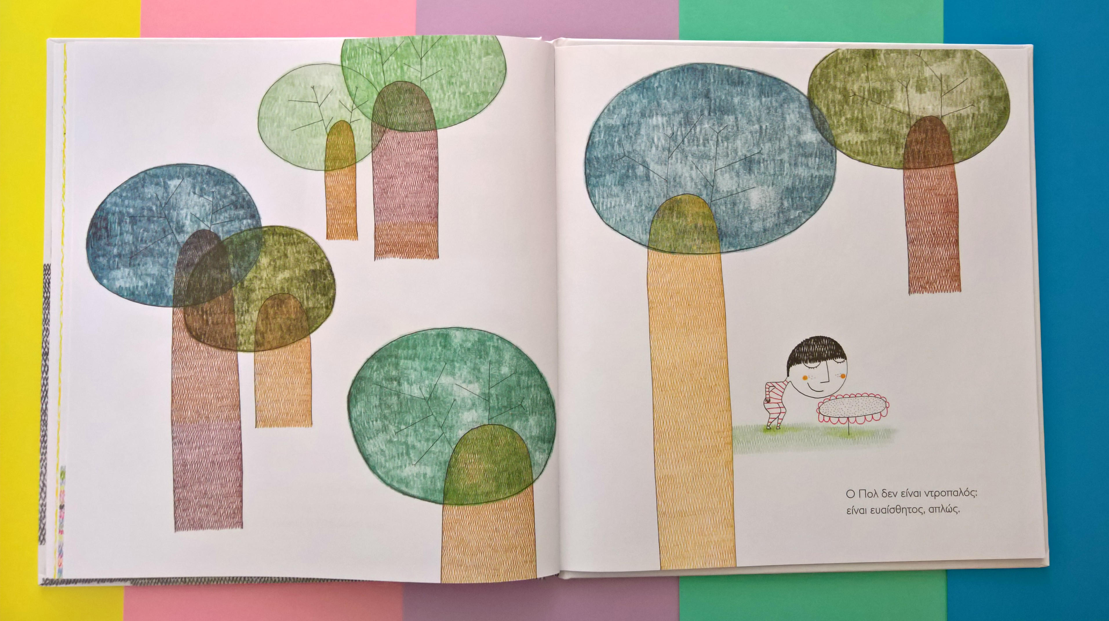 Όνειρο του Πολ είναι να ταξιδέψει και να γνωρίσει ολόκληρο τον κόσμο. Στο χρωματιστό ταξίδι του συναντά το καφετί στα μονοπάτια, το ροζ που υπάρχει στη χαρά, το μωβ στα ωραία δειλινά, το κίτρινο της αμμουδιάς, κ.α. αλλά πουθενά δεν βρίσκει το χρώμα που κάνει τα παιδιά μεγάλους. Ανακαλύπτει όμως ότι ο κόσμος είναι γεμάτος χρωματιστά συναισθήματα που αντανακλούν τον δικό του συναισθηματικό κόσμο, χρώματα για τη λύπη, τη χαρά, το θυμό, την αγάπη, το γέλιο.