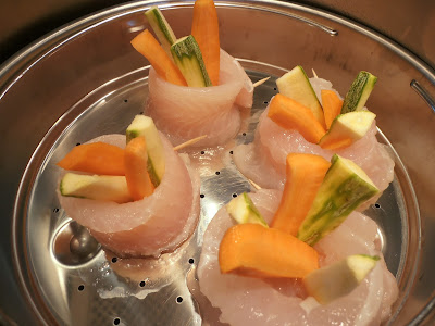 3)Μέσα σε κάθε ρολό βάζω μερικά μπαστουνάκια καρότο και κολοκύθι και τα τοποθετώ στο σκεύος για μαγείρεμα στον ατμό.