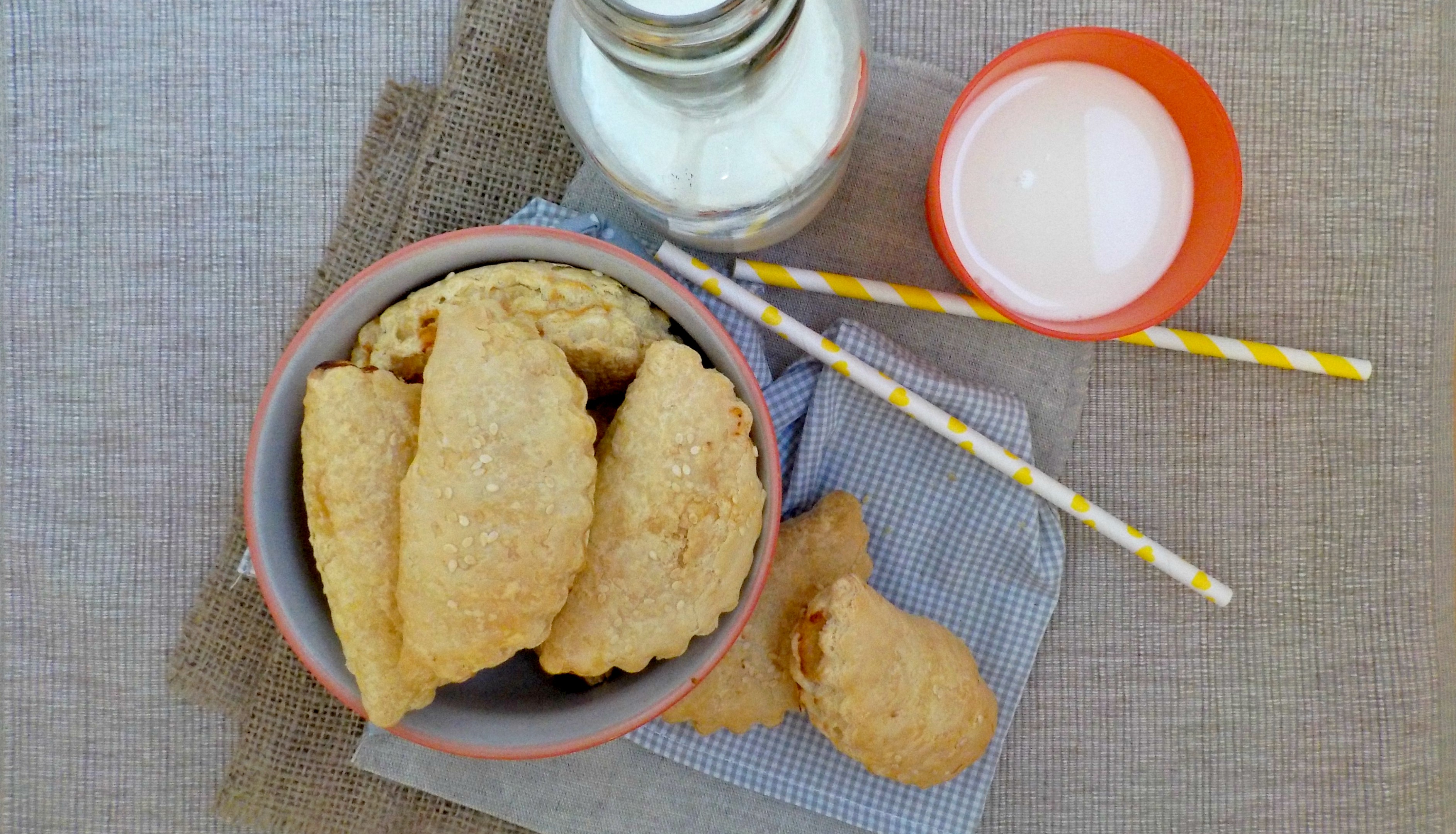 4)Τοποθετούμε τα σφολιατάκια σε ένα ταψί με λαδόκολλα. Πασπαλίζουμε με λίγο σουσάμι και ψήνουμε σε προθερμασμένο φούρνο στους 190 C (ανάλογα με το φούρνο) στις αντιστάσεις για 25-30 λεπτά ή ώσπου να ροδοκοκκινήσουν.