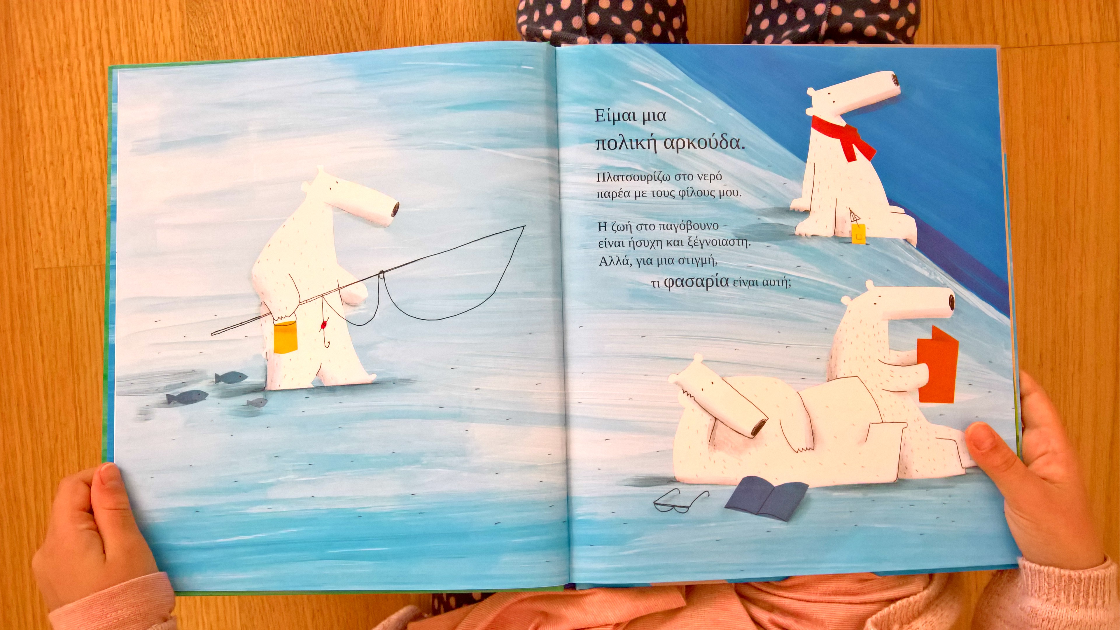 Είναι ένα βιβλίο με όμορφη και χαρούμενη εικονογράφηση που μας έδωσε την αφορμή να συζητήσουμε για το πόσο δύσκολο μπορεί να είναι για κάποιον να αναγκαστεί να φύγει από τον τόπο του, να γίνει αποδεκτός σε ένα άλλο μέρος και να αποκτήσει ένα καινούργιο σπιτικό και νέους φίλους. Επίσης, μας έδωσε την ευκαιρία να σχολιάσουμε τις κλιματικές αλλαγές όπως το λιώσιμο των πάγων, την αύξηση της θερμοκρασίας, κ.α., για ποιο λόγο συμβαίνουν όλα αυτά αλλά και τι μπορούμε να κάνουμε εμείς από την πλευρά μας.