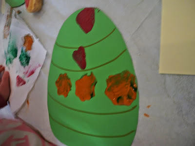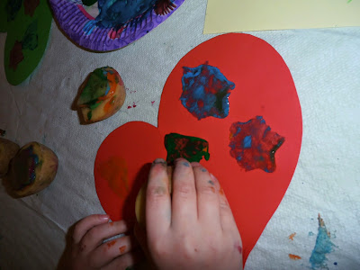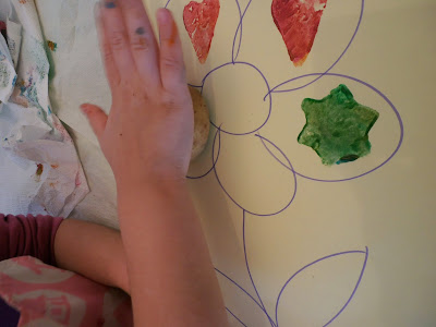 Στην αρχή η ζουζουνα μου βουτούσε τη σφραγίδα στο πιάτο με τα χρώματα αλλά έτσι έμενε μεγάλη ποσότητα χρώματος στη σφραγίδα και δεν ήταν εύχρηστη. Έτσι καταλήξαμε να βουτάει το δάχτυλο της στα χρώματα και να αλοίφει την επιφάνεια της σφραγίδας.