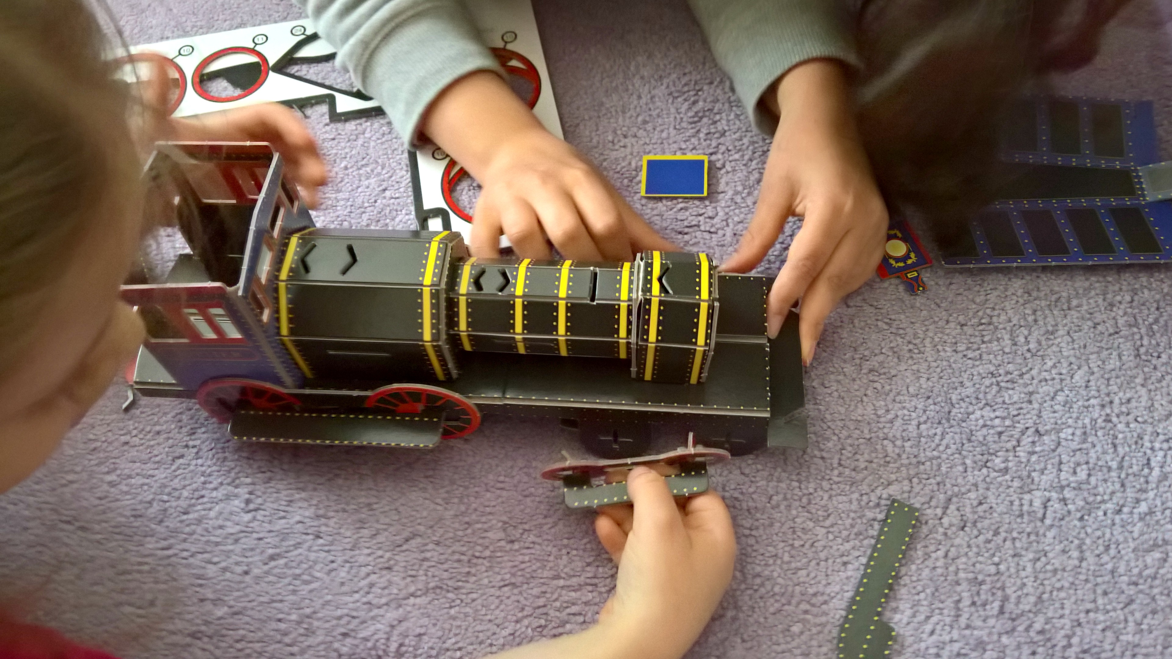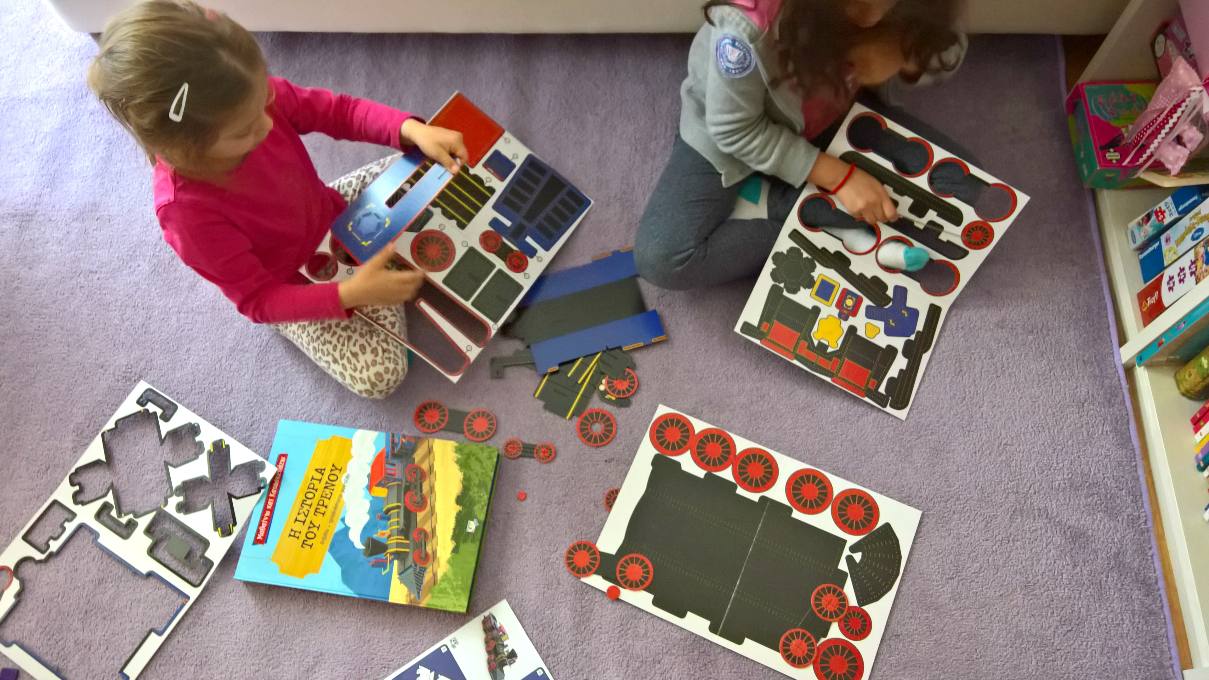 Βέβαια το πιο ωραίο σημείο του βιβλίου (σύμφωνα με τις κόρες μου) ήταν εκεί που ανοίξαμε το κουτί στο τέλος του βιβλίου και βγάλαμε τα κομμάτια του τρένου! Με τη βοήθειά μου κι ακολουθώντας τις οδηγίες του εγχειριδίου, συναρμολογήσαμε ένα τρισδιάστατο τρένο από ανθεκτικό χαρτόνι που αμέσως βρήκε χώρο στο δωμάτιο της Ελένης (που έγινε σιδηροδρομικός σταθμός).