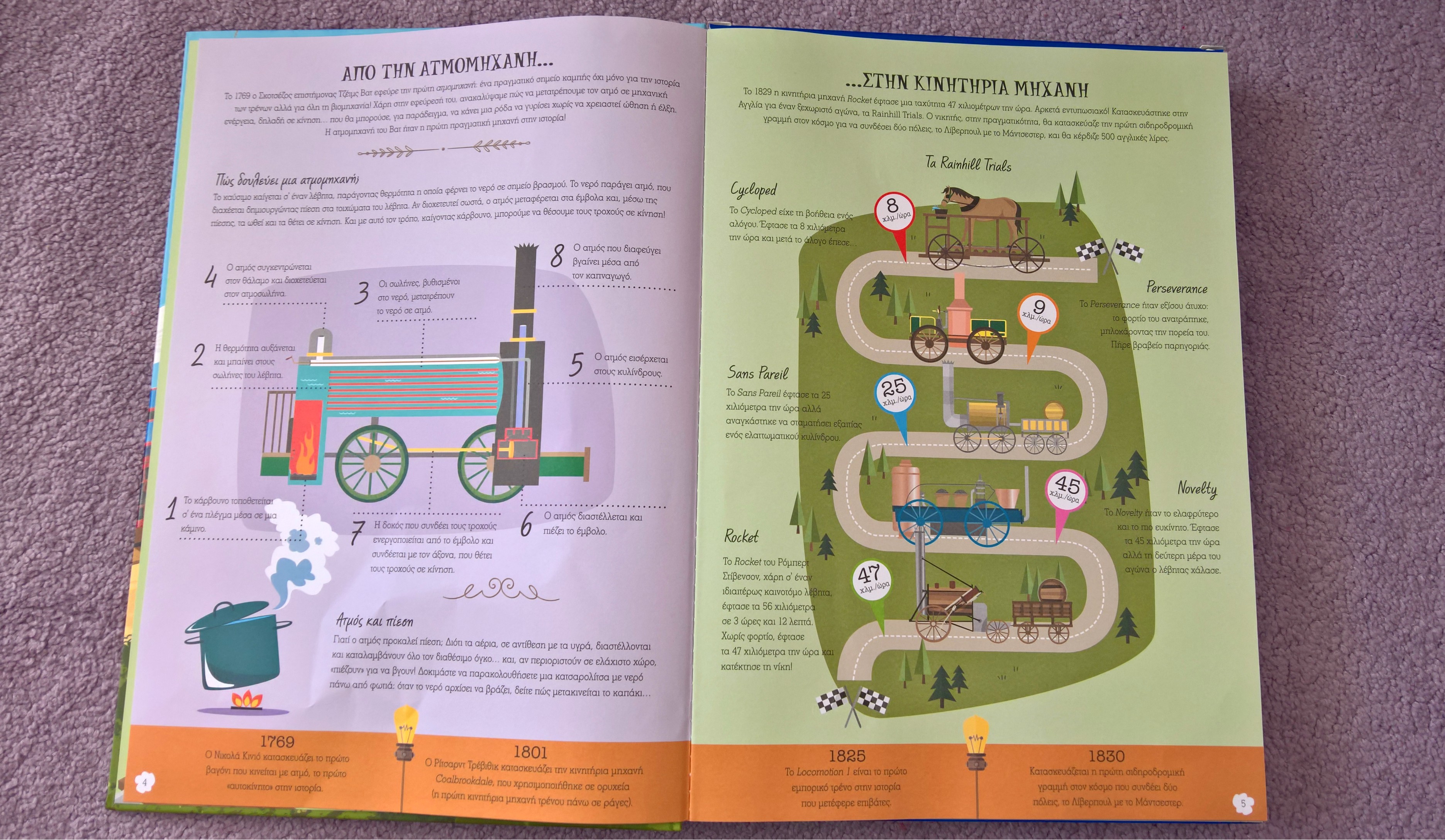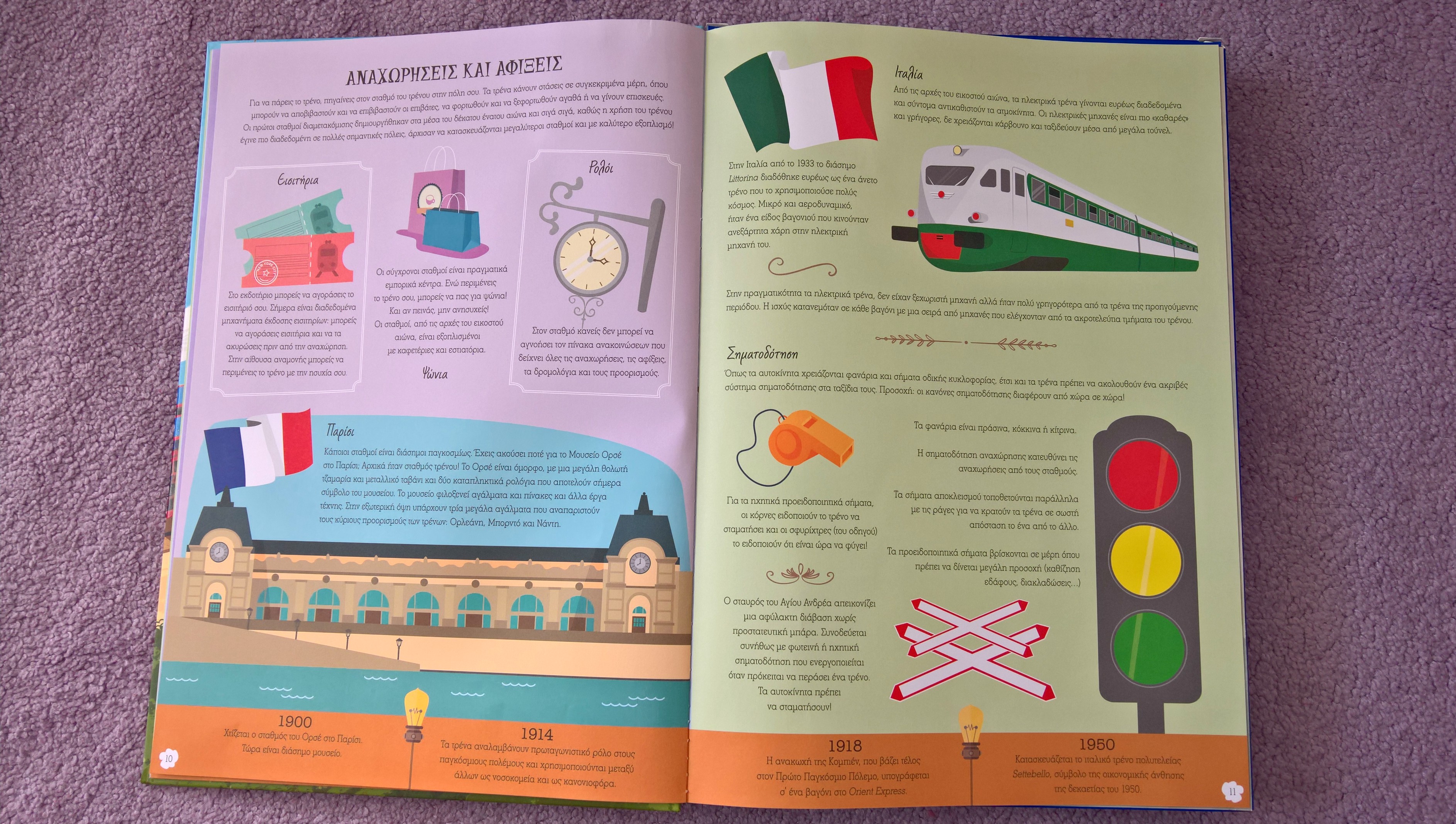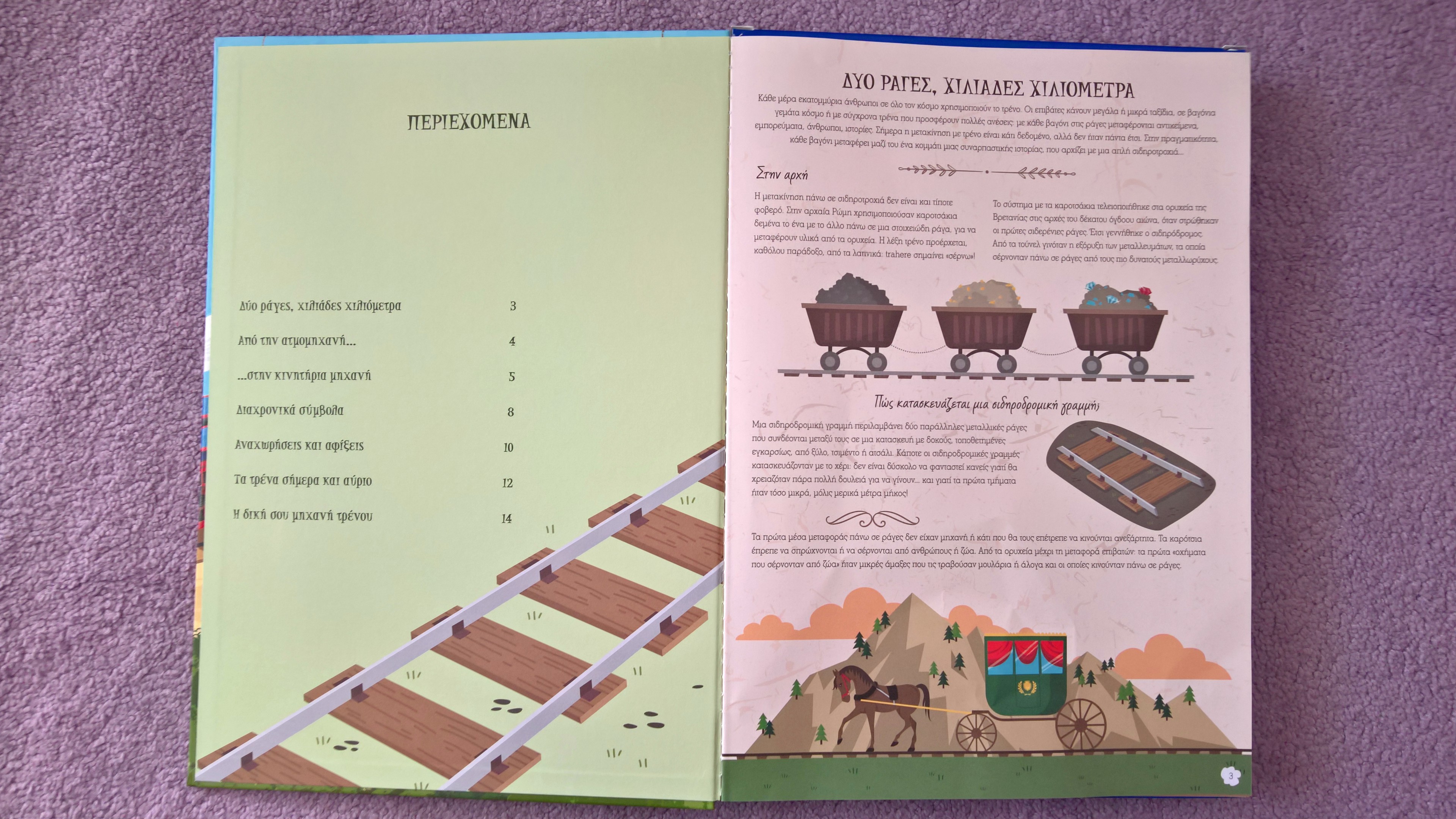 Το βιβλίο ξεκινάει μιλώντας για την ιστορία του τρένου, για το πως ήταν στην αρχική του μορφή και για το πως κατασκευάζεται μία σιδηροδρομική γραμμή. Εσείς ξέρετε ότι η λέξη τρένο προέρχεται από τη λατινική λέξη trahere που σημαίνει “σέρνω”? Εμείς το διαβάσαμε στο βιβλίο!