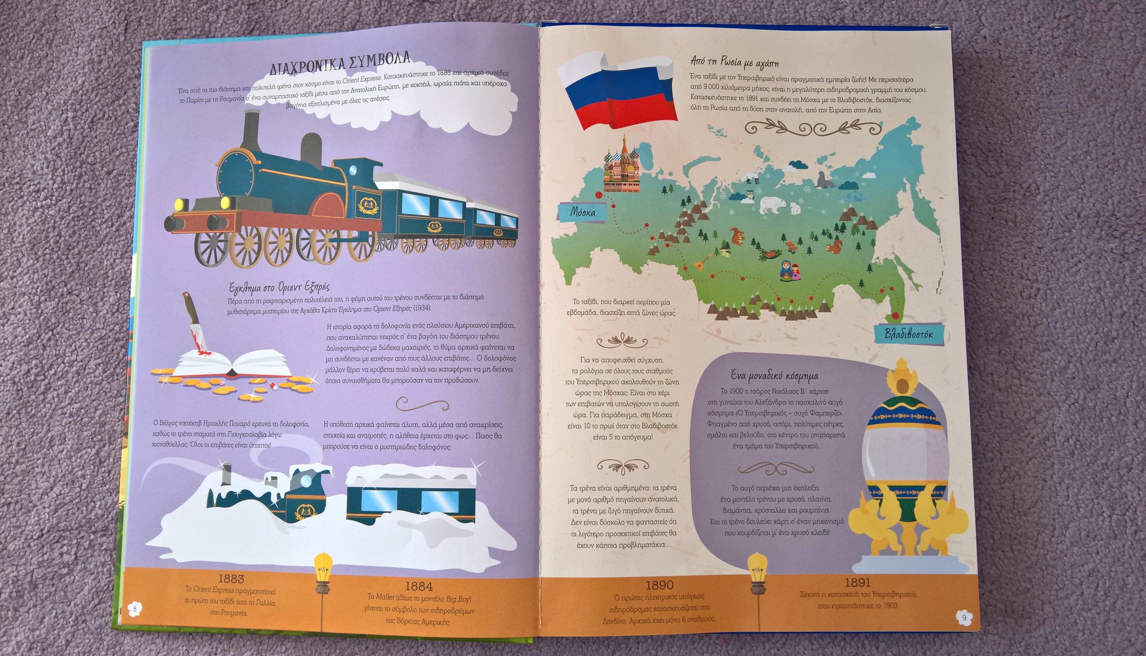 Το ενδιαφέρον των κοριτσιών μου κορυφώθηκε στην ενότητα με τα διαχρονικά σύμβολα, όπου αναφέρεται ένα από τα πιο διάσημα και πολυτελή τρένα στον κόσμο, το Orient Express, που κατασκευάστηκε το 1883 και συνέδεε το Παρίσι με τη Ρουμανία. Οι θαμώνες του απολάμβαναν ένα συναρπαστικό ταξίδι μέσα από την Ανατολική Ευρώπη, με κοκτέιλ, ωραία πιάτα και υπέροχα βαγόνια εξοπλισμένα με όλες τις ανέσεις. Η φήμη αυτού του τρένου συνδέεται με το πολύ γνωστό μυθιστόρημα της Αγκάθα Κρίστι “Έγκλημα στο Όριεντ Εξπρές”, που αναφέρεται σε έναν πλούσιο Αμερικανό επιβάτη που τον βρίσκουν δολοφονημένο μέσα σε ένα βαγόνι του διάσημου τρένου.