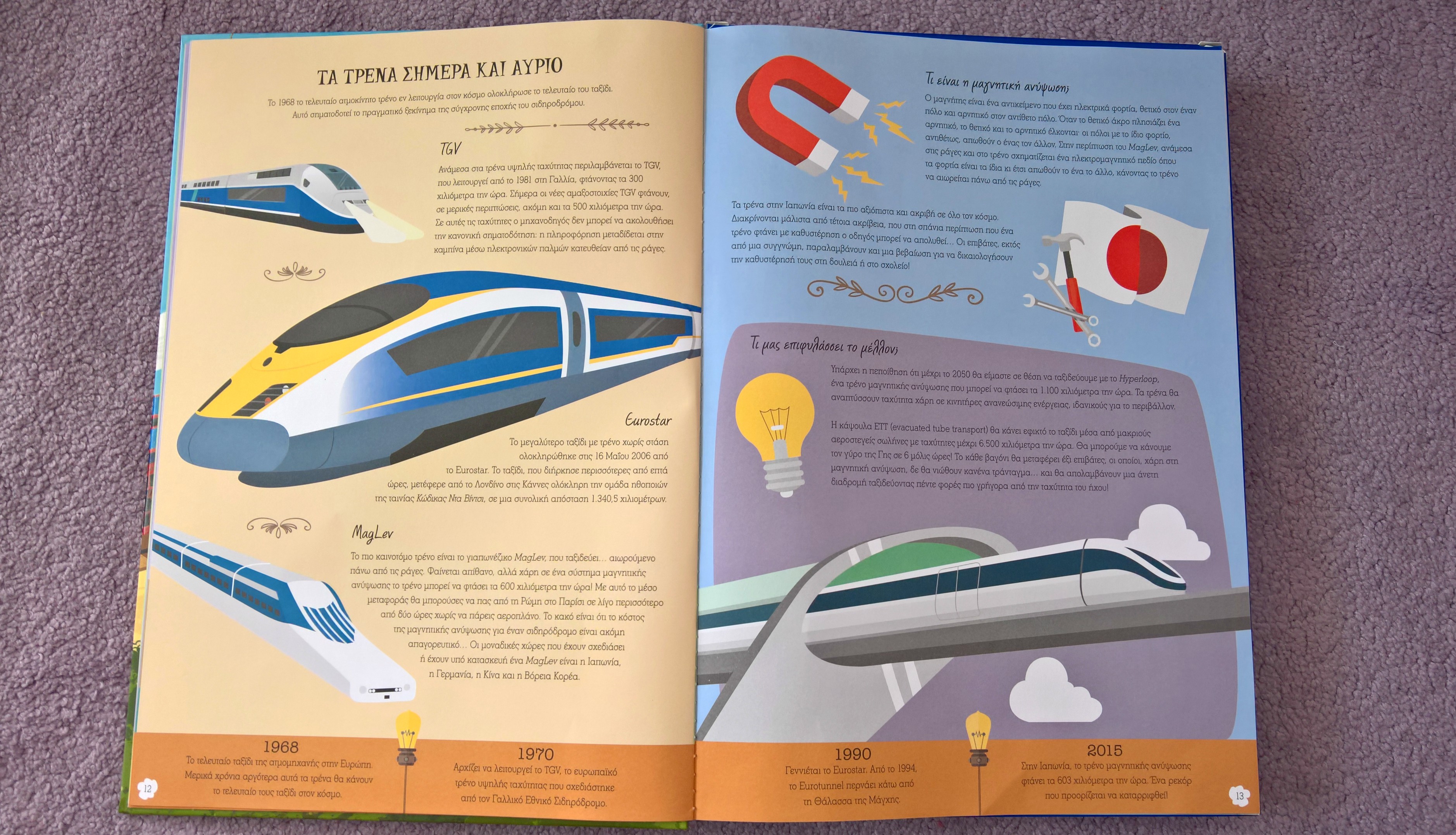 Στην τελευταία ενότητα “Τα τρένα σήμερα και αύριο”, το βιβλίο μας δίνει πληροφορίες για τα τρένα που υπάρχουν μέχρι σήμερα αλλά και του μέλλοντος, καθώς και για το φαινόμενο της μαγνητικής ανύψωσης. Δηλαδή το φαινόμενο όπου ανάμεσα στις ράγες και στο τρένο σχηματίζεται ένα ηλεκτρομαγνητικό πεδίο όπου τα φορτία είναι τα ίδια κι έτσι απωθούν το ένα το άλλο κάνοντας το τρένο να αιωρείται πάνω στις ράγες.