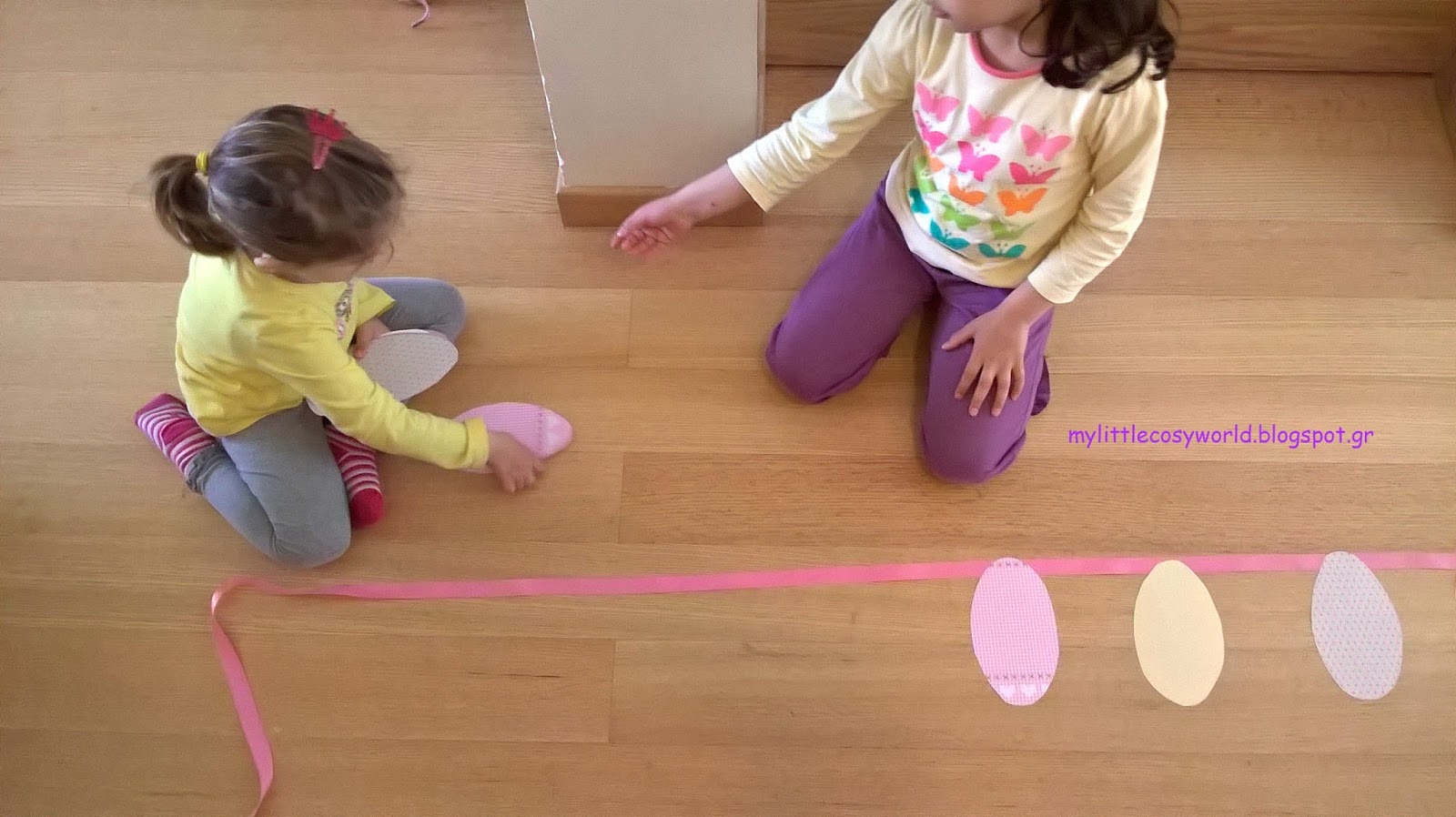 Ύστερα τα κορίτσια έβαλαν την κορδέλα τεντωμένη στο πάτωμα και τοποθέτησαν τα αυγά όπως θα τα συρράπταμε. Επειδή όμως τα χρώματά μας ήταν αρκετά απαλά και δεν θέλαμε να φαίνεται το συρματάκι από το συρραπτικό τελικά προτίμησα να τα κολλήσω με πιστόλι σιλικόνης (σίγουρα όμως με το συρραπτικό η γιρλάντα θα είναι πιο γερή).