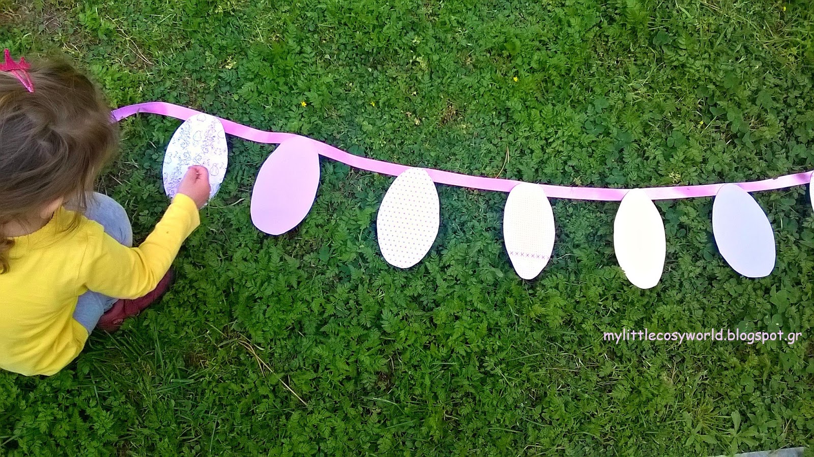 Το Πάσχα πλησιάζει και η διάθεσή μας είναι γιορτινή και χαρούμενη και αυτό φαίνεται και στις κατασκευές μας! Για την ακρίβεια έχουμε γίνει εργαστήριο πασχαλινών κατασκευών αφού η μαμά έχει άδεια από την δουλειά της και γι΄αυτό ο χρόνος για χειροτεχνίες είναι περισσότερος! Έτσι σήμερα είπαμε να σας δείξουμε την πασχαλινή γιρλάντα που φτιάξαμε και να σας δώσουμε οδηγίες για να την κάνετε κι εσείς! Είναι τόσο εύκολη χειροτεχνία που με μια ματιά είμαι σίγουρη πως θα ξέρετε αμέσως πως να φτιάξετε μια γιρλάντα για οποιαδήποτε εποχή!
