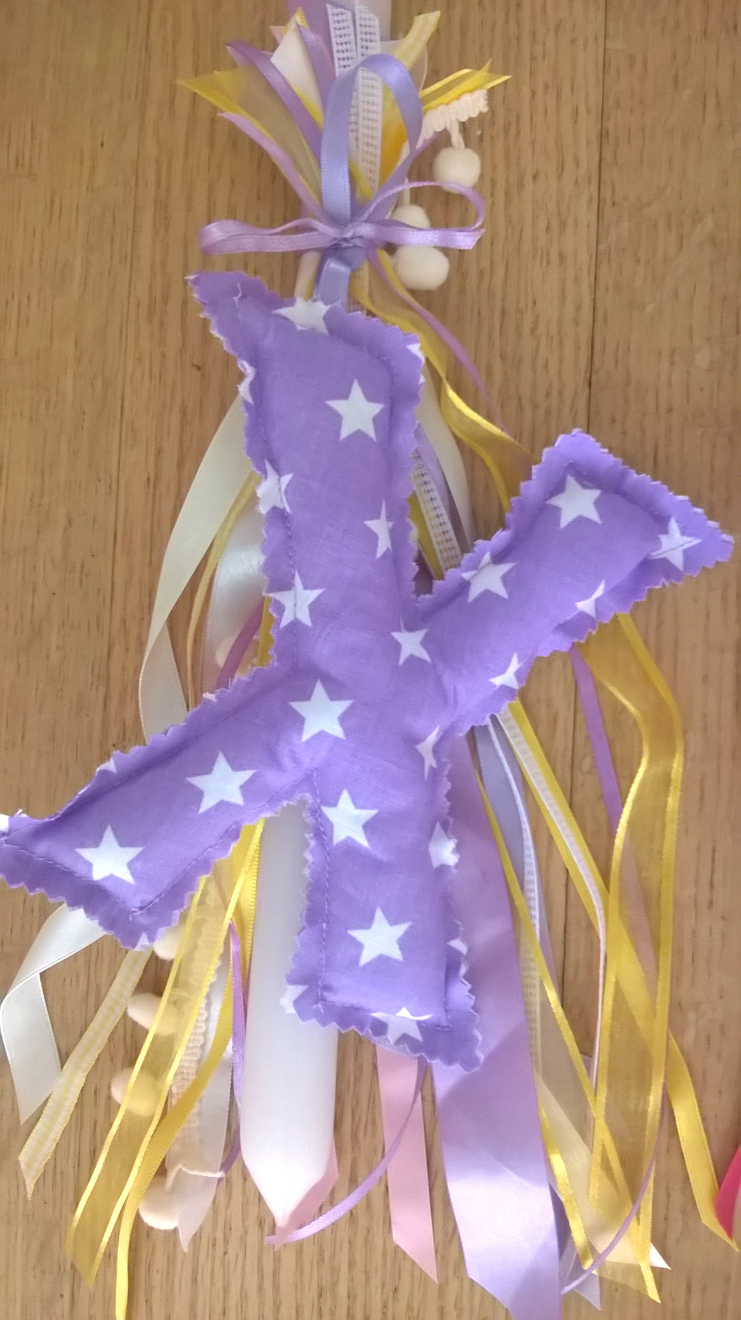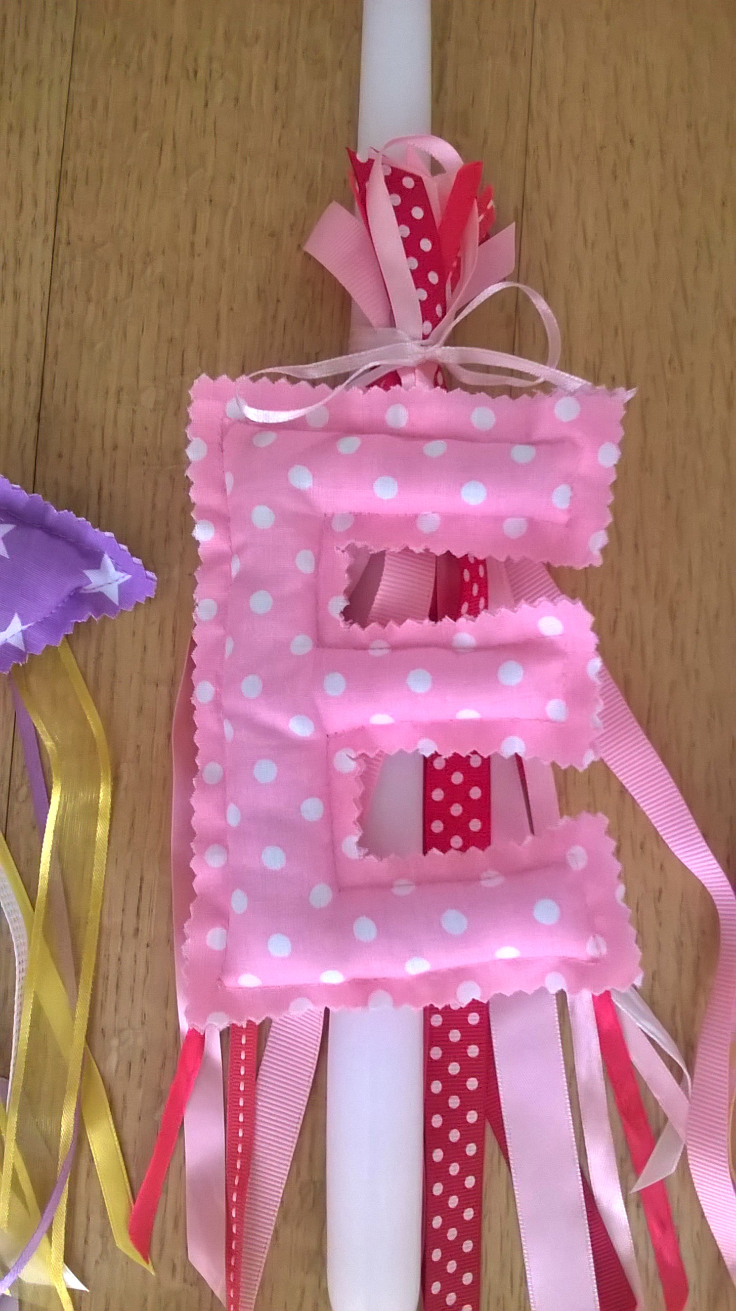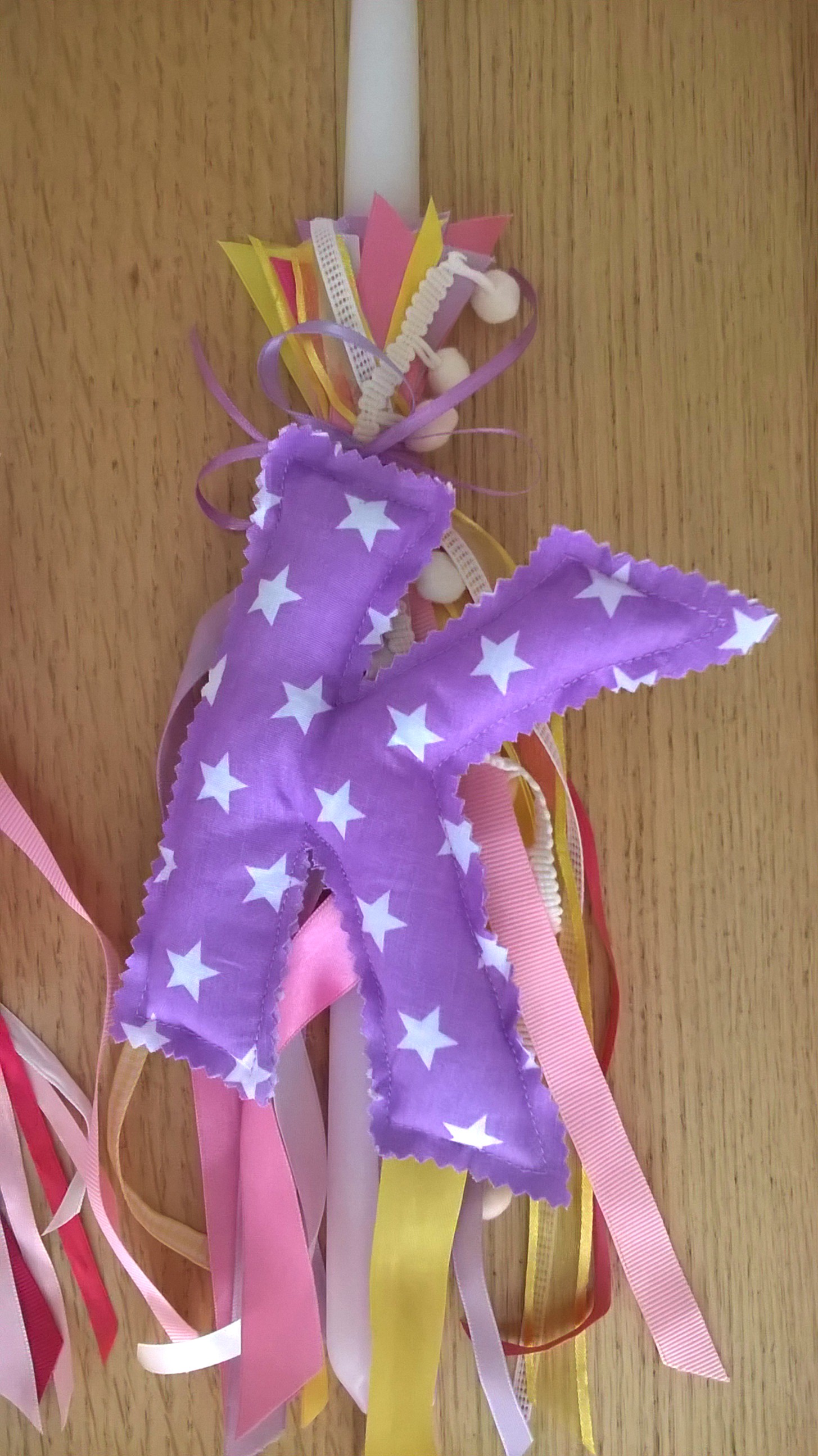 Αγόρασα κεριά και στόλισα τις λαμπάδες μας με αρκετές κορδέλες σε ταιριαστά χρώματα! Τις κορδέλες τις έδεσα πάνω στο μονόγραμμα για να μείνουν ως διακοσμητικές ακόμα κι όταν το ξεκρεμάσουν από την λαμπάδα. Εύχομαι να τους αρέσουν και να αγαπήσουν τα μαξιλαράκια με το μονόγραμμά τους όσο κι εγώ γιατί πραγματικά τα έφτιαξα με πολύ χαρά και μεράκι!