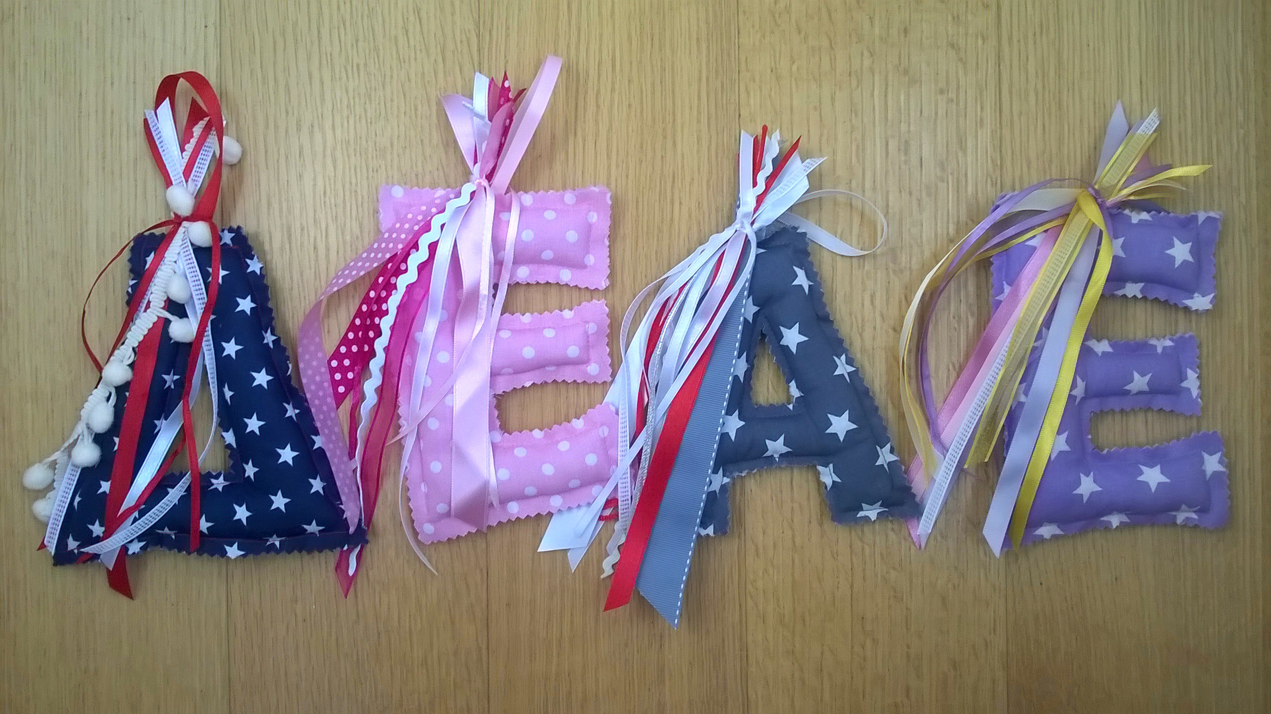 Έβαλα και μία κορδελίτσα για να μπορούν να τα κρεμάσουν και μετά έραψα στη μηχανή μου (εναλλακτικά τα ράβετε στο χέρι) τα μονογράμματα με ίδια κλωστή. Άφησα μία πλευρά χωρίς ραφή για να γεμίσω το μαξιλαράκι με υαλοβάμβακα (ή υλικό γεμίσματος μαξιλαριών) και έτοιμο το μονόγραμμα της καθεμιάς τους!