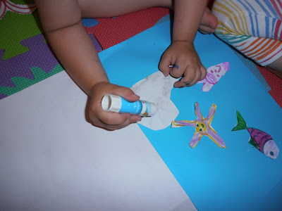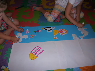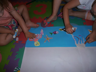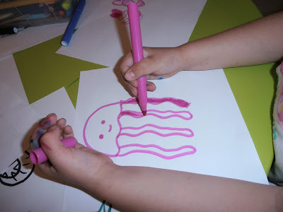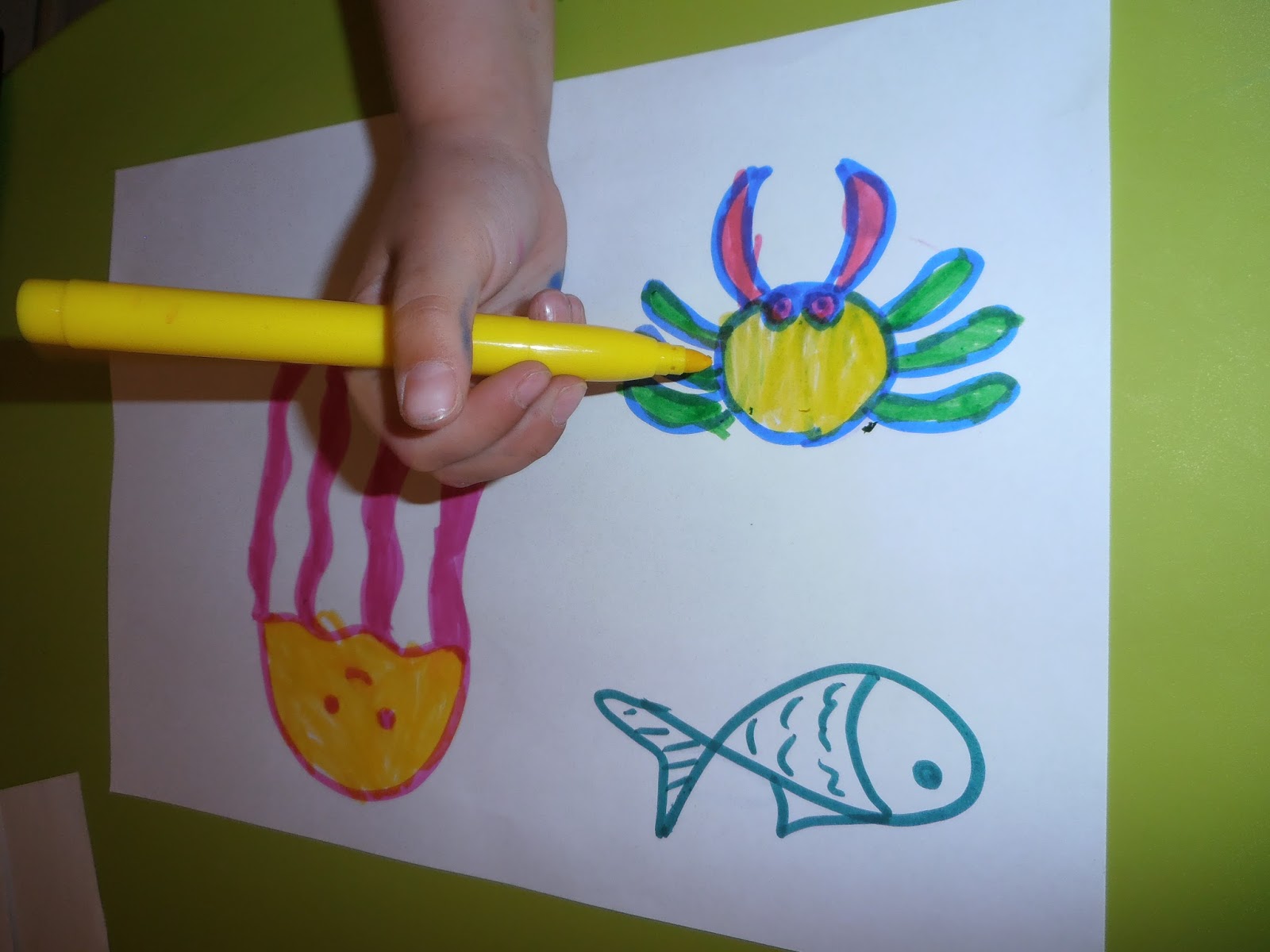 Μετά σχεδίασα σε λευκές κόλλες διάφορα ζωάκια της θάλασσας (χταπόδι, χελώνα, αστερία, φάλαινα, ιππόκαμπο, ψάρι, καβούρι, μέδουσα, κ.α.). Φυσικά μπορείτε να τυπώσετε έτοιμες χρωμοσελίδες με ζωάκια της θάλασσας από το διαδίκτυο.