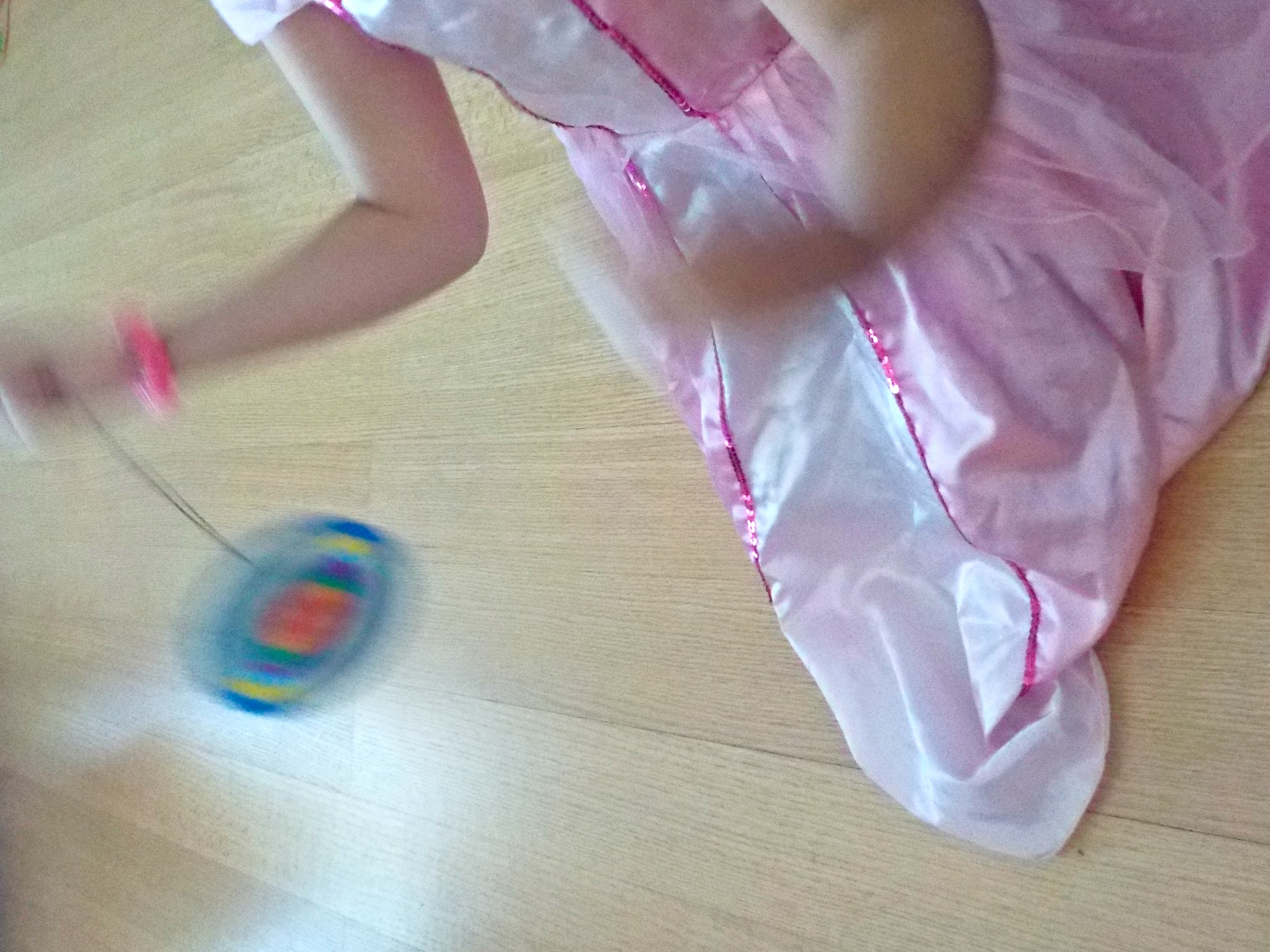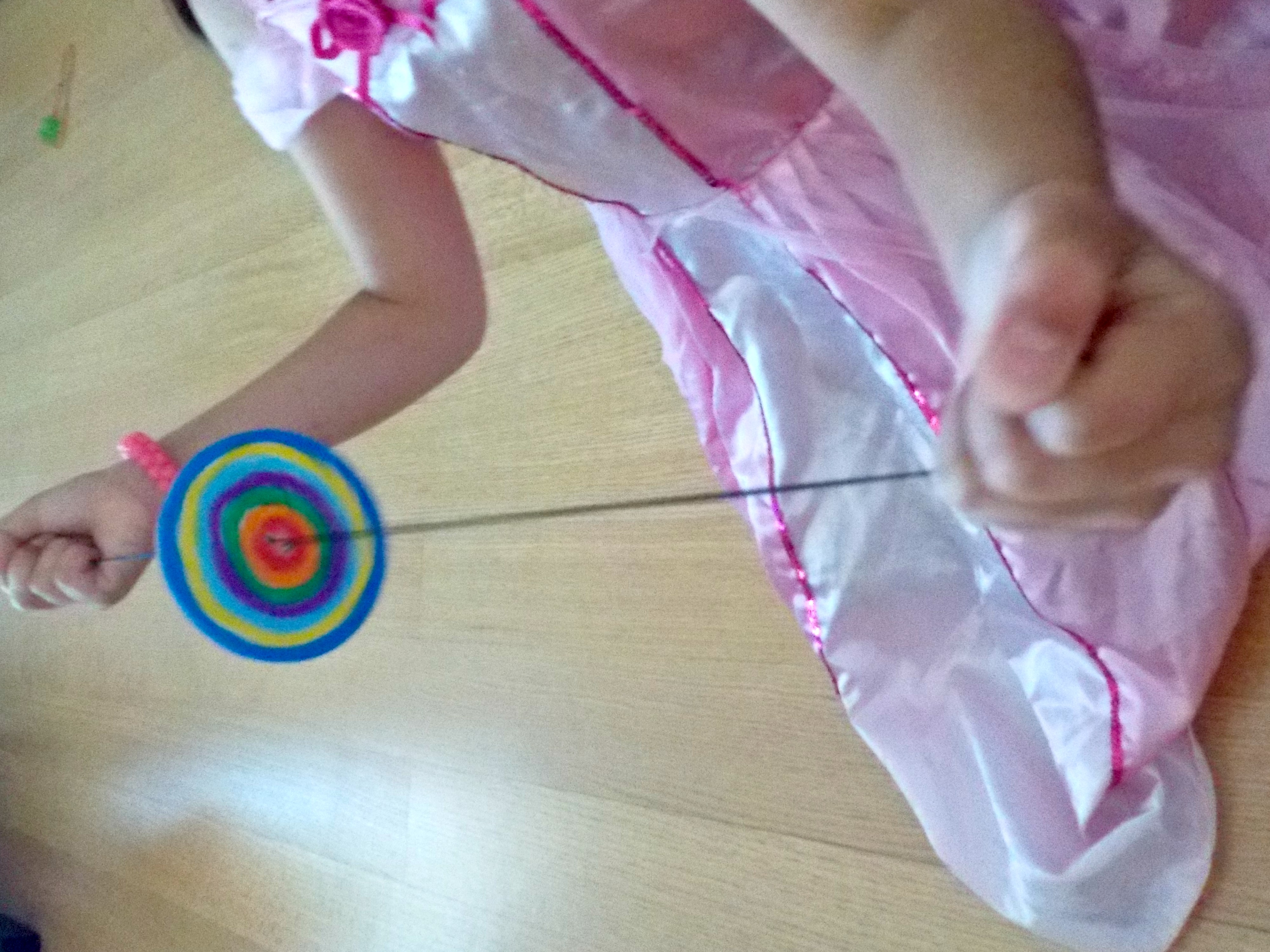 Το παιδί κρατάει από τις δύο άκρες το σπάγκο και το στριφογυρίζει στον αέρα. Μόλις τεντώσει τον σπάγκο τότε το spinner συνεχίζει να στριφογυρίζει μόνο του και το παιχνίδι δεν έχει σταματημό! Οι μικρές “κόλλησαν” και μαζί τους κι εγώ!!!