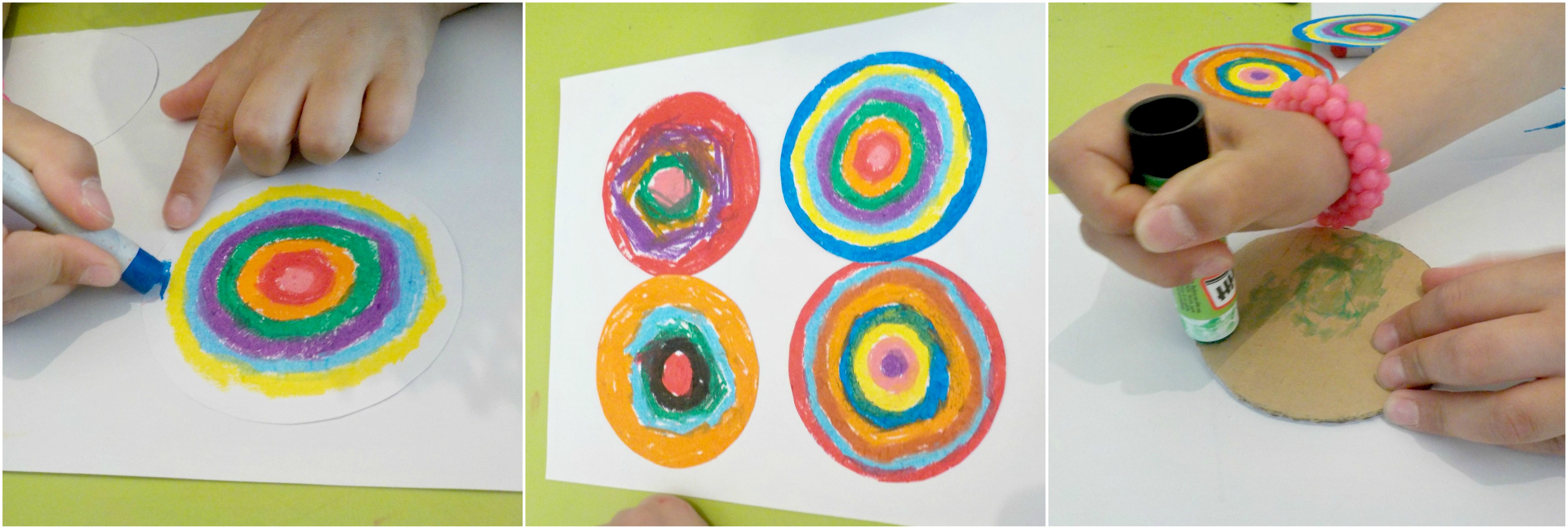 Αν το χαρτόνι μας είναι άσπρο μπορούμε να πούμε στο παιδί να το χρωματίσει απευθείας και να κάνει ότι σχέδια θέλει στις δύο πλευρές.  Εναλλακτικά μπορούμε να κολλήσουμε κάποιο χαρτί περιτυλίγματος στις δύο όψεις του κύκλου μας.