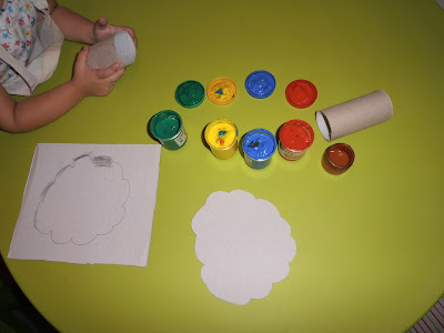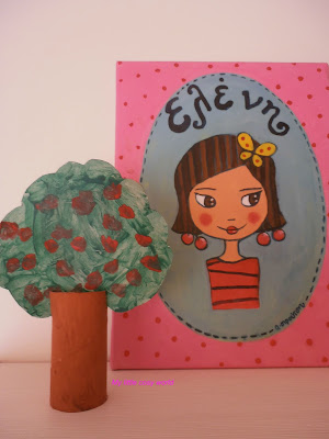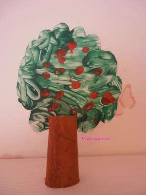 Για τη βάση του δέντρου χρησιμοποιήσαμε τα γνωστά ρολά από χαρτί υγείας όπου έκανα με το ψαλίδι δύο αντιδιαμετρικά κοψίματα για να μπει η φυλλωσιά του δέντρου. Τα κορίτσια έβαψαν τον κορμό με χρώματα της επιλογής τους!