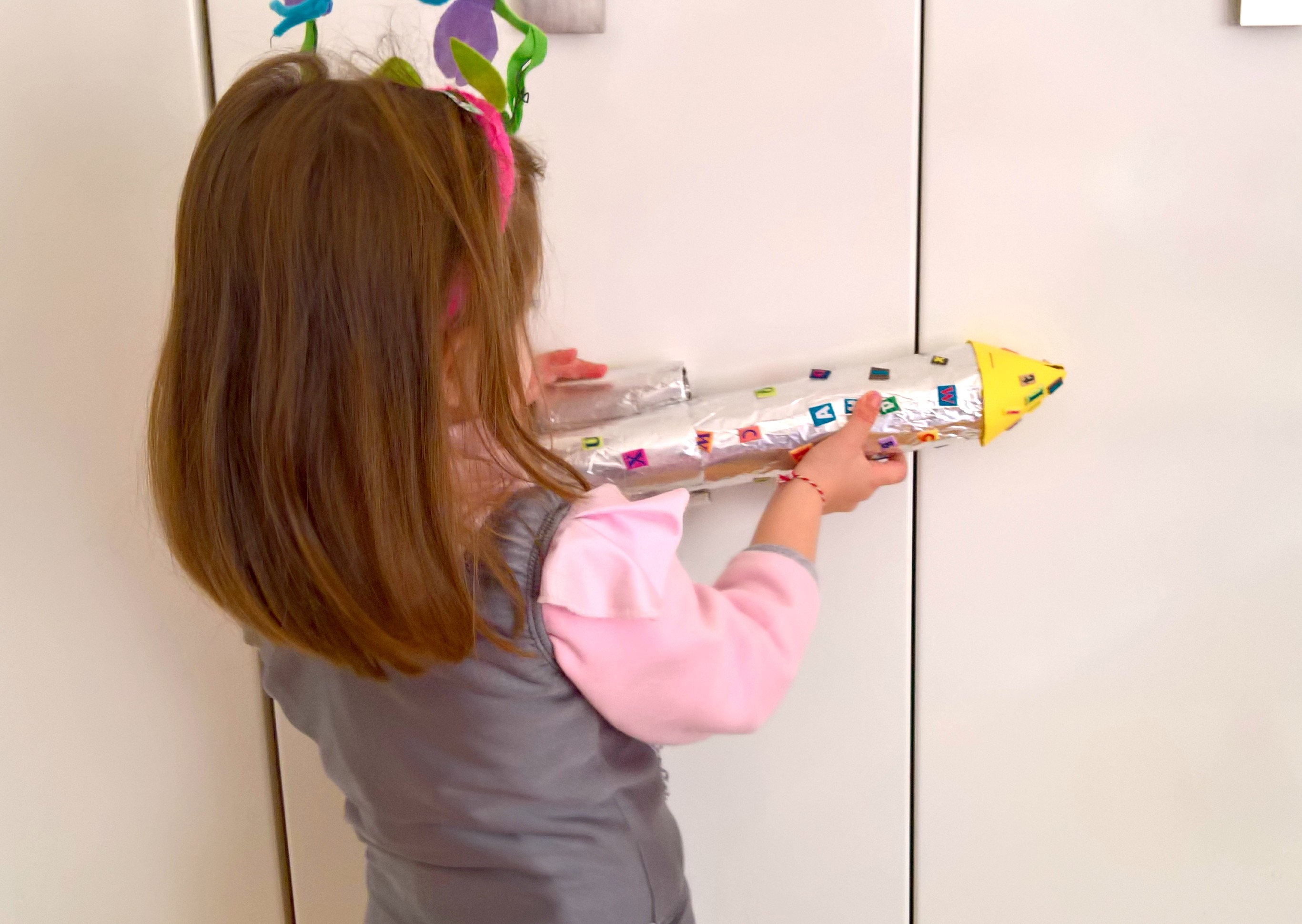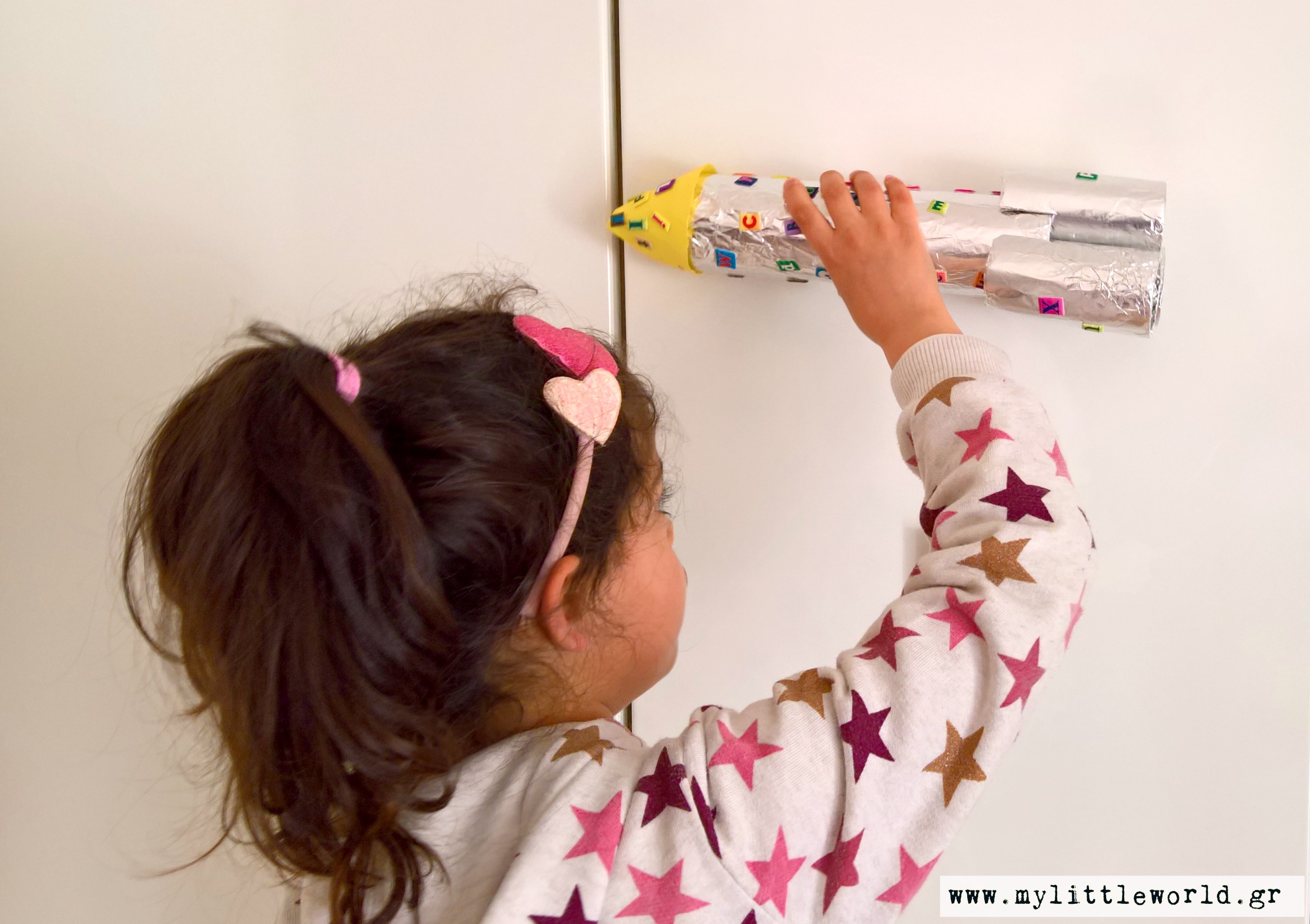 Φτιάξαμε ένα φανταστικό πύραυλο με ρολά από χαρτί υγείας και τα κορίτσια μου ενθουσιάστηκαν κι έπαιξαν πολύ μαζί του! Παίζουν τα κορίτσια με πυραύλους; Βεβαίως και παίζουν και μάλιστα το απολαμβάνουν πολύ! Ίσως ο πύραυλος να σας φαίνεται πιο αγορίστικο παιχνίδι! Εμένα πάλι όχι. Είναι που δεν μου αρέσει να βάζω ταμπέλες και να λέω ότι τα κορίτσια παίζουν μόνο με κούκλες και τα αγόρια μόνο με αυτοκινητάκια! Μου φαίνεται, πως να το πω, κάπως στενόμυαλη σκέψη αυτή.