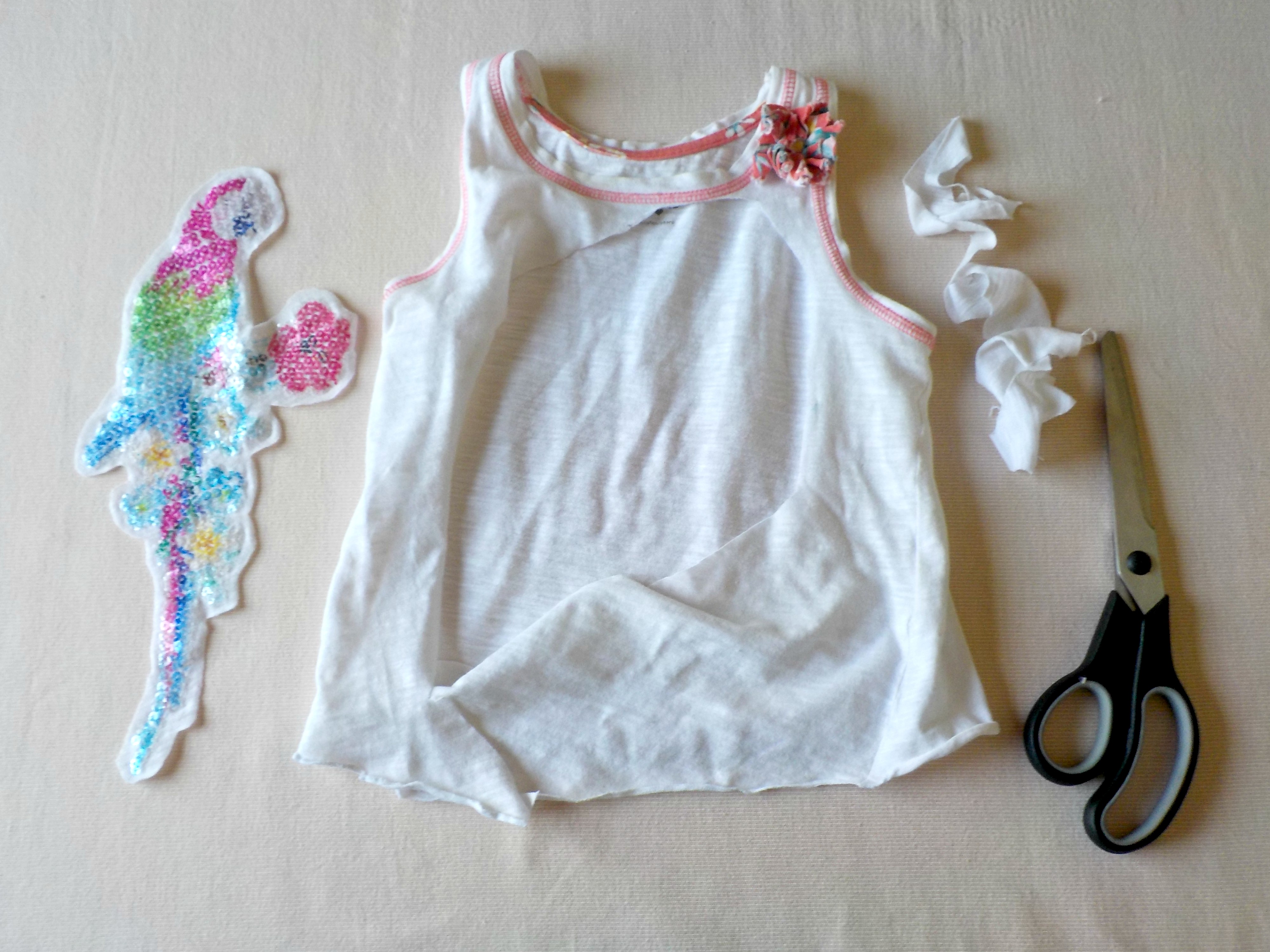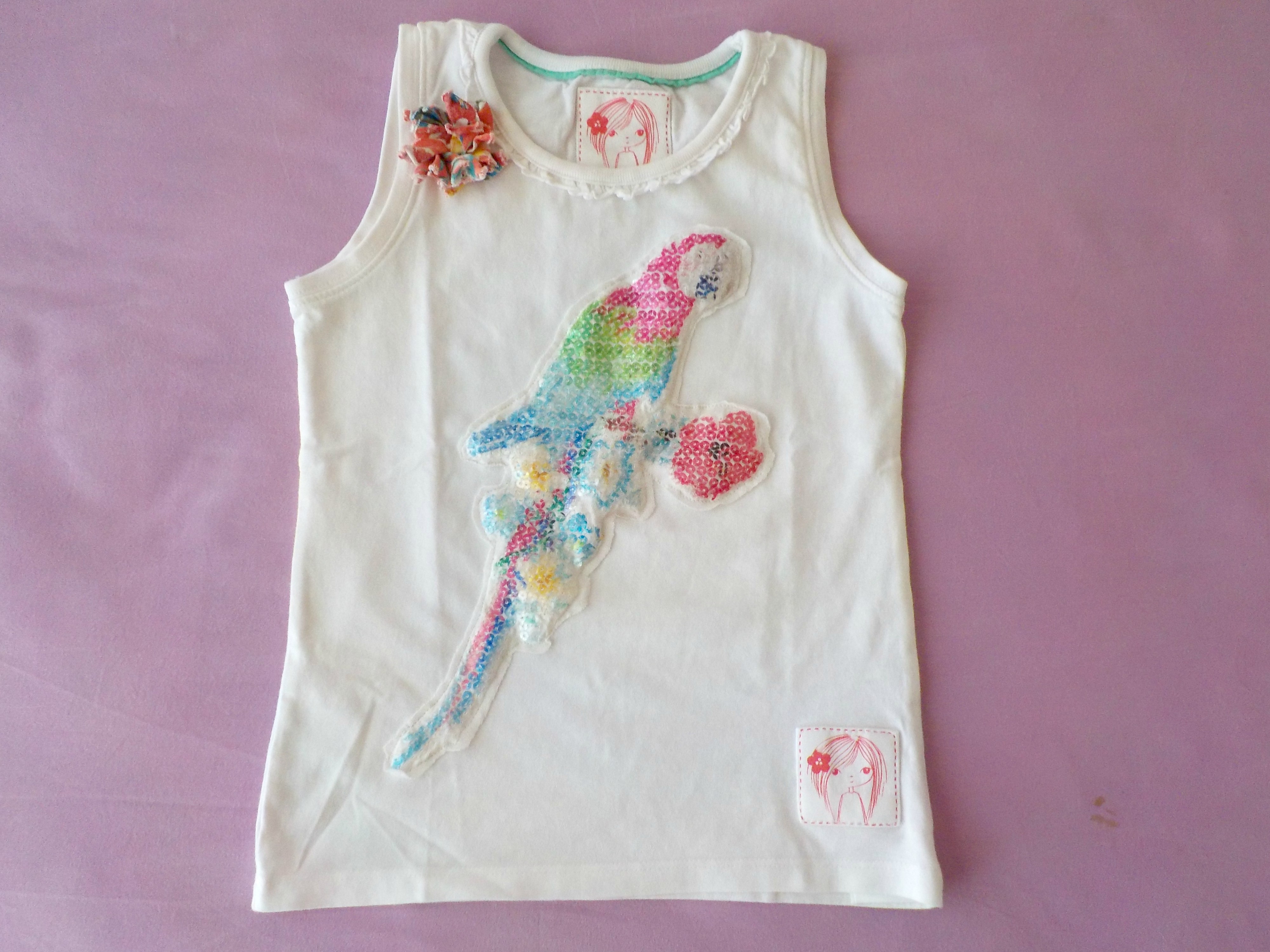 Απλούστατο! Έκοψα το κομμάτι γύρω γύρω από τον χρωματιστό παπαγάλο και το έραψα πάνω σε μια παρόμοια εντελώς λευκή μπλούζα. Έραψα και το λουλουδάκι στην τιράντα της μπλούζας και έτοιμη! Μου πήρε περίπου 15 λεπτά για να τη φτιάξω και η χαρά της ήταν απερίγραπτη!