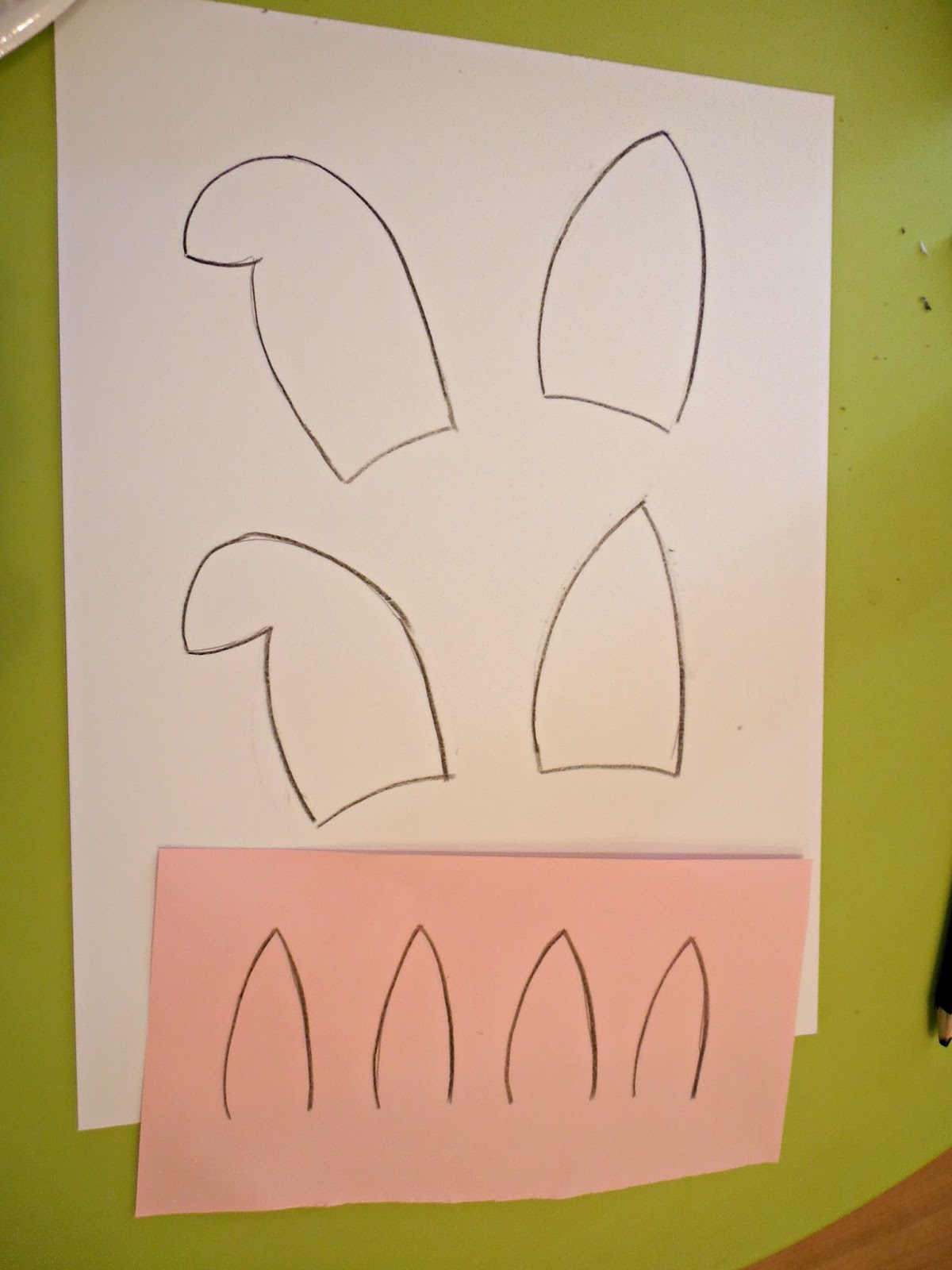 Στο λευκό χαρτόνι σχεδίασα αυτιά κούνελου (μπορείτε να βρείτε σε χρωμοσελιδες στο διαδίκτυο, τις λεγόμενες colouring pages) και στο ροζ χαρτί τα κομματάκια που θα κολλούσαμε πάνω στα αυτιά.