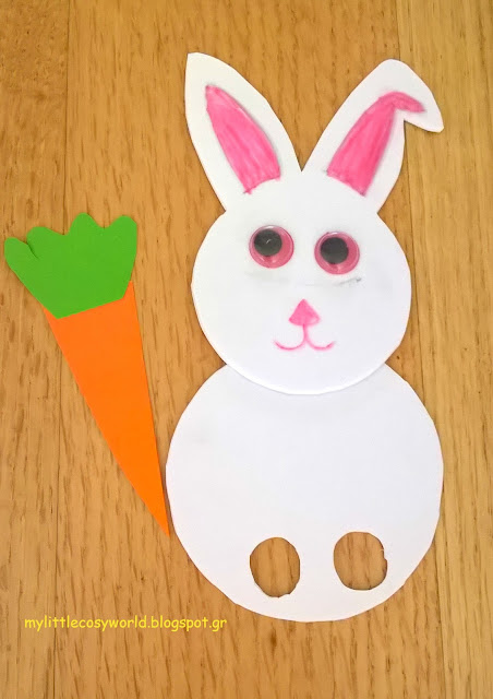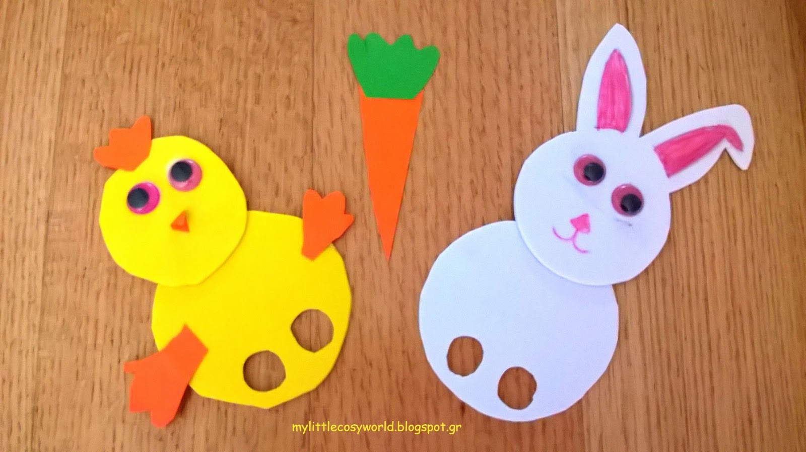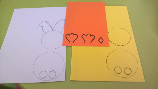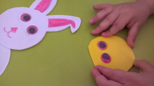 Σχεδιάζουμε δύο κύκλους σε κάθε αφρώδες χαρτί (ο ένας κύκλος είναι ελαφρώς μικρότερος από τον άλλο γιατί είναι το κεφάλι). Φτιάχνω και δύο μικράκυκλάκια στο σώμα για να μπουν τα δαχτυλάκια των παιδιών. Επίσης, φτιάχνω αυτιά στο κεφάλι του κούνελου και χεράκια και ράμφος για το κοτοπουλάκι. Χρησιμοποιείστε ως παράδειγμα την παρακάτω φωτογραφία και μη σας νοιάζει εάν δεν βγουν τέλεια αφού στα μάτια των παιδιών σας θα είναι απλά φανταστικά!