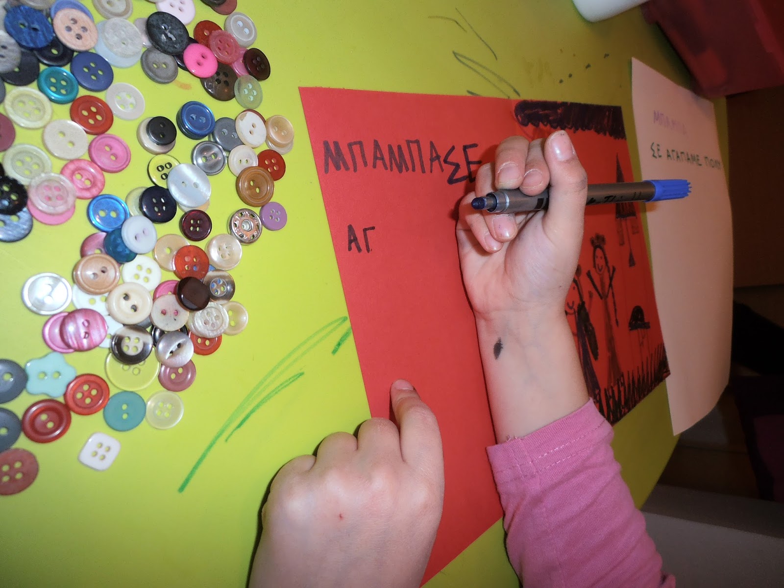 Πριν ξεκινήσουμε να κολλάμε τα κουμπιά στην κάρτα μας, τα κορίτσια έκαναν στα χαρτιά τους από μία ζωγραφιά και η Ελένη έγραψε πόσο πολύ αγαπάνε τον μπαμπά τους!