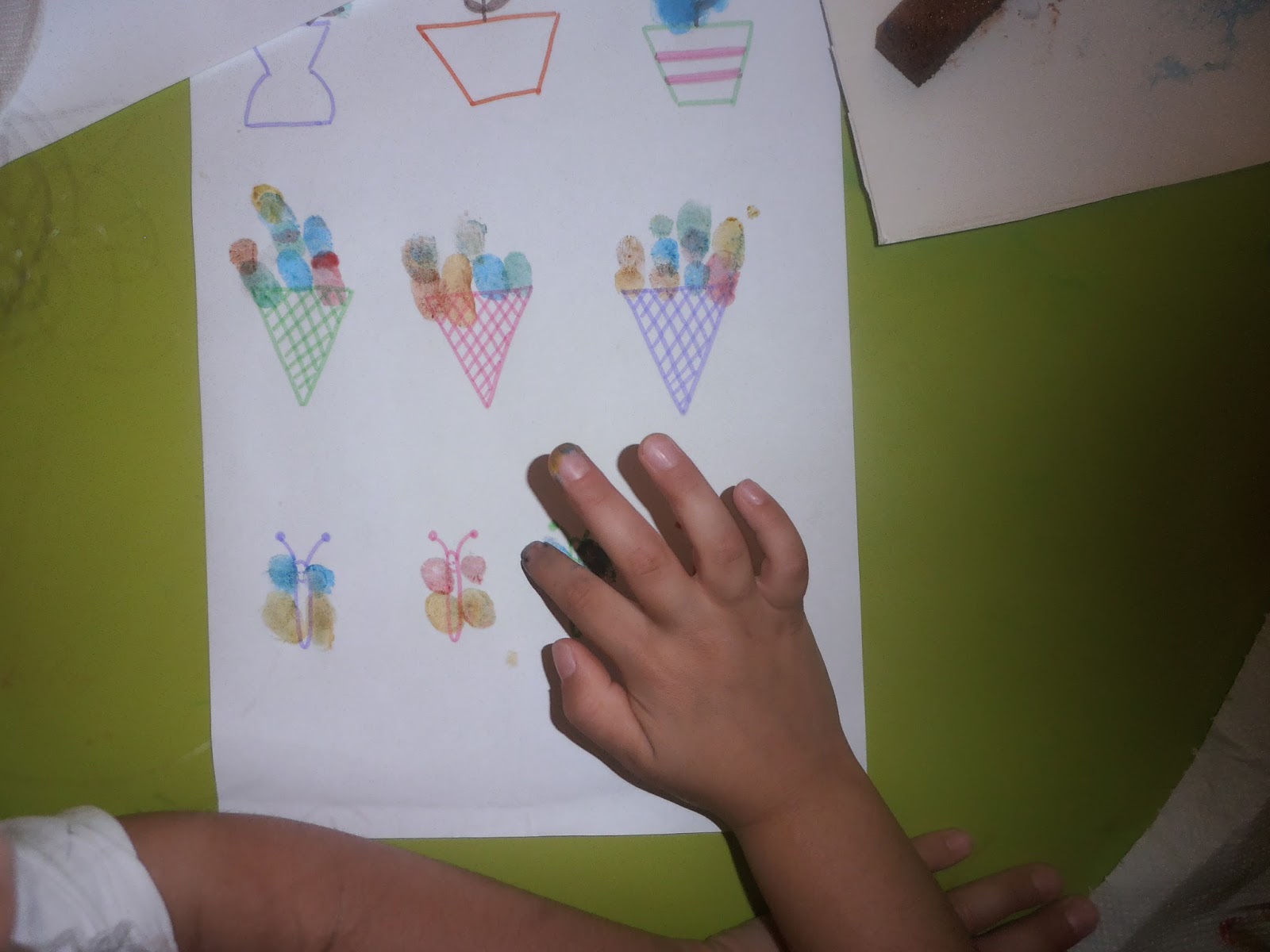 Παίρνουμε ένα σφουγγάρι και το κόβουμε σε κομμάτια τα οποία βρέχουμε με λίγο νερό και απλώνουμε πάνω το χρώμα δαχτυλομπογιάς που θέλουμε.
