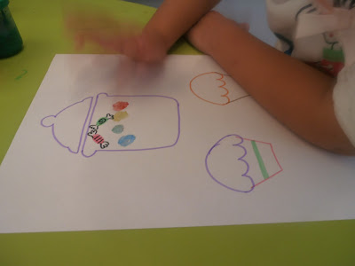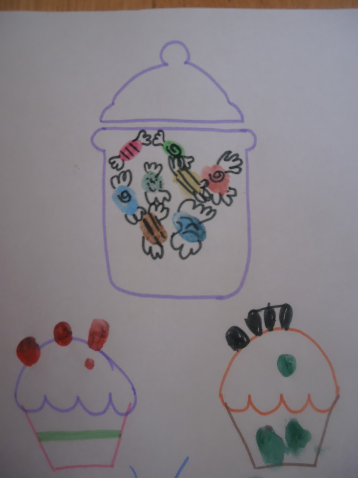 Αφού έκαναν το αποτύπωμα με το δαχτυλάκι τους η μεγάλη ζουζούνα ζωγράφισε μόνη της “το περιτύλιγμα” στις καραμέλες, ενώ της μικρής μου της το ζωγράφισα εγώ.