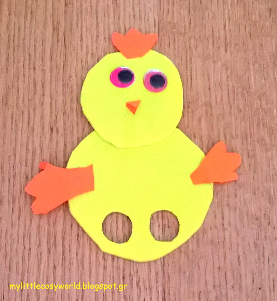 Σχεδιάζουμε δύο κύκλους σε κάθε αφρώδες χαρτί (ο ένας κύκλος είναι ελαφρώς μικρότερος από τον άλλο γιατί είναι το κεφάλι). Φτιάχνω και δύο μικράκυκλάκια στο σώμα για να μπουν τα δαχτυλάκια των παιδιών. Επίσης, φτιάχνω αυτιά στο κεφάλι του κούνελου και χεράκια και ράμφος για το κοτοπουλάκι. Χρησιμοποιείστε ως παράδειγμα την παρακάτω φωτογραφία και μη σας νοιάζει εάν δεν βγουν τέλεια αφού στα μάτια των παιδιών σας θα είναι απλά φανταστικά!